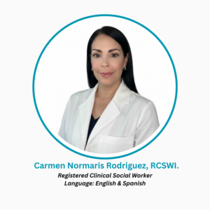 Carmen Normaris Rodriguez, RCSWI. She holds a Bachelor of Science in Psychology and a Master’s degree in Clinical Social Work. She is a Registered Clinical Social Worker with compassionate clinical experience providing client-centered, trauma-informed care to individuals and families navigating emotional challenges and life transitions. Carmen has experience working with individuals experiencing anxiety, depression, and trauma, and she integrates Cognitive Behavioral Therapy (CBT), holistic approaches, and mindfulness-based interventions to support emotional regulation, resilience, and overall well-being. Fluent in both English and Spanish, Carmen is committed to providing culturally sensitive care to a diverse population. She believes in the importance of connection, self-care, and personal growth, and brings these values into her clinical practice. Outside of work, Carmen enjoys reading, writing, traveling, and spending quality time with family and friends.